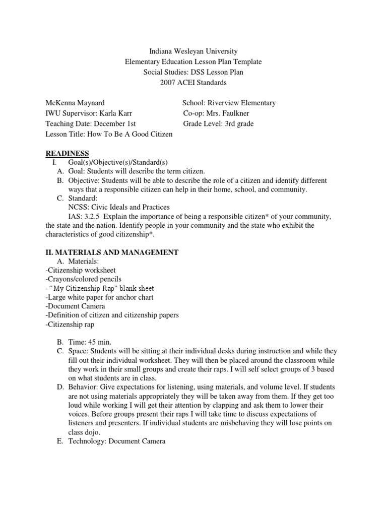 Social Studies Lesson Plan 2 Citizenship Lesson Plan