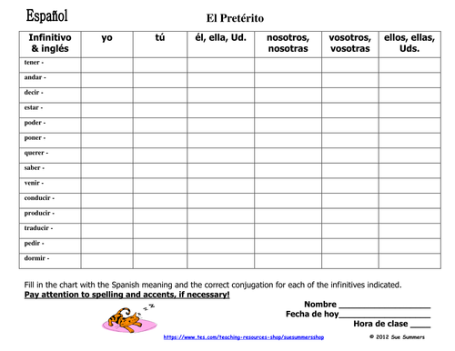 Spanish Preterit Verb Chart 14 Irregular Preterit Verbs By Sue
