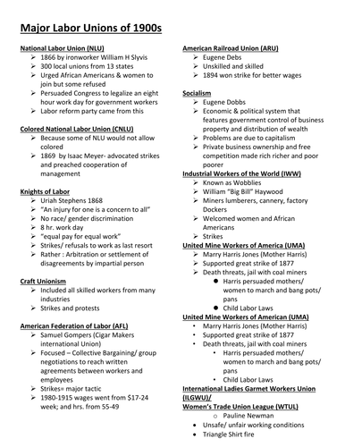 Progressive Era Major Labor Unions Of 1900s Chart Teaching